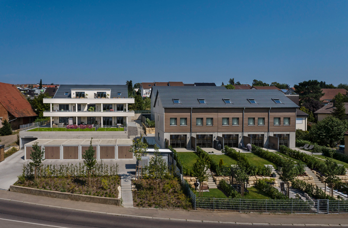 In diesem Wohnquartier haben wir insgesamt 9 Reihenhäuser mit Einzelgaragen sowie 8 Wohnungen mit Tiefgarage im Energieeffizienz-Standard KfW 55 gebaut. Die Gärten der Reihenhäuser wurden von den Eigentümern selbst angelegt und bepflanzt.