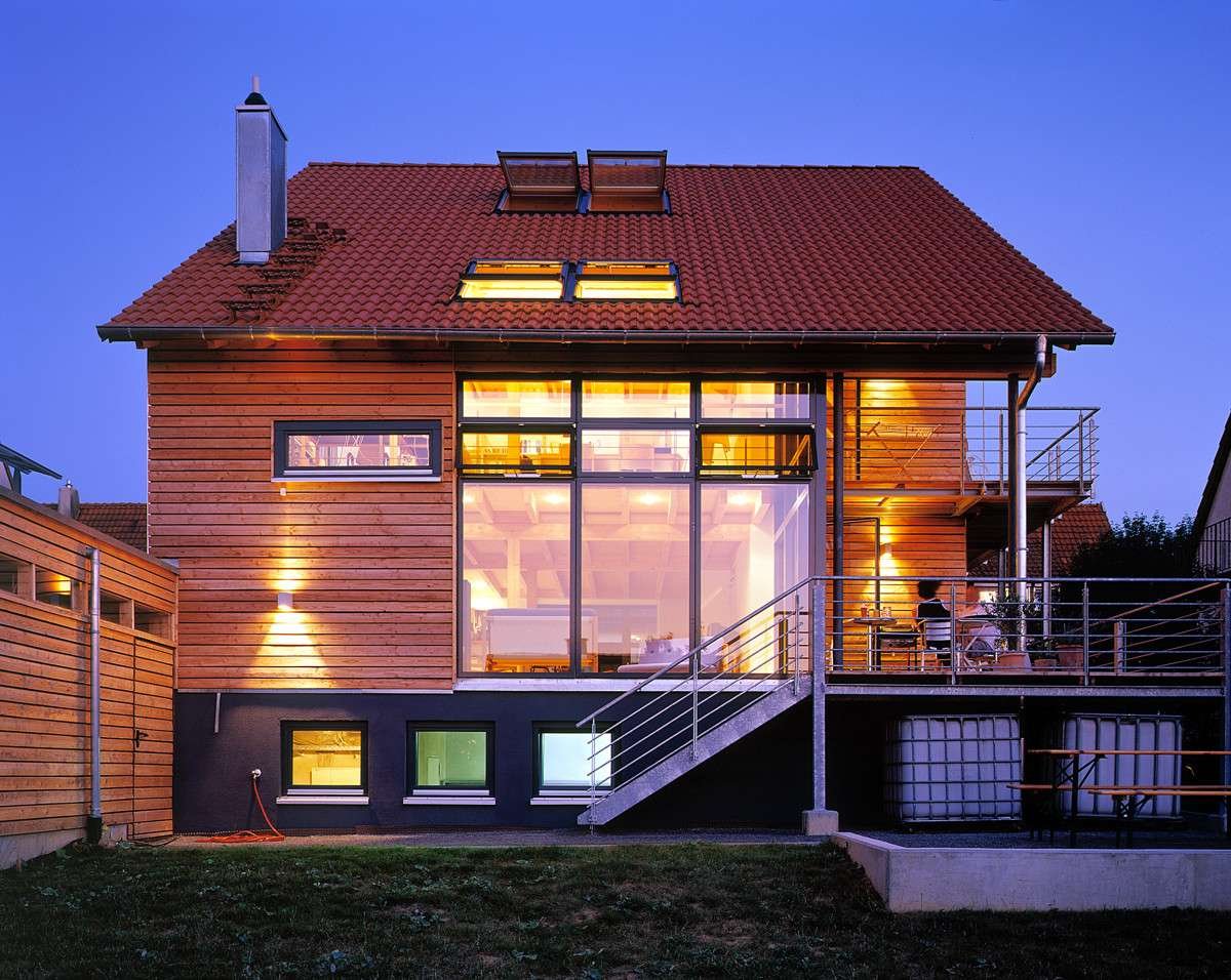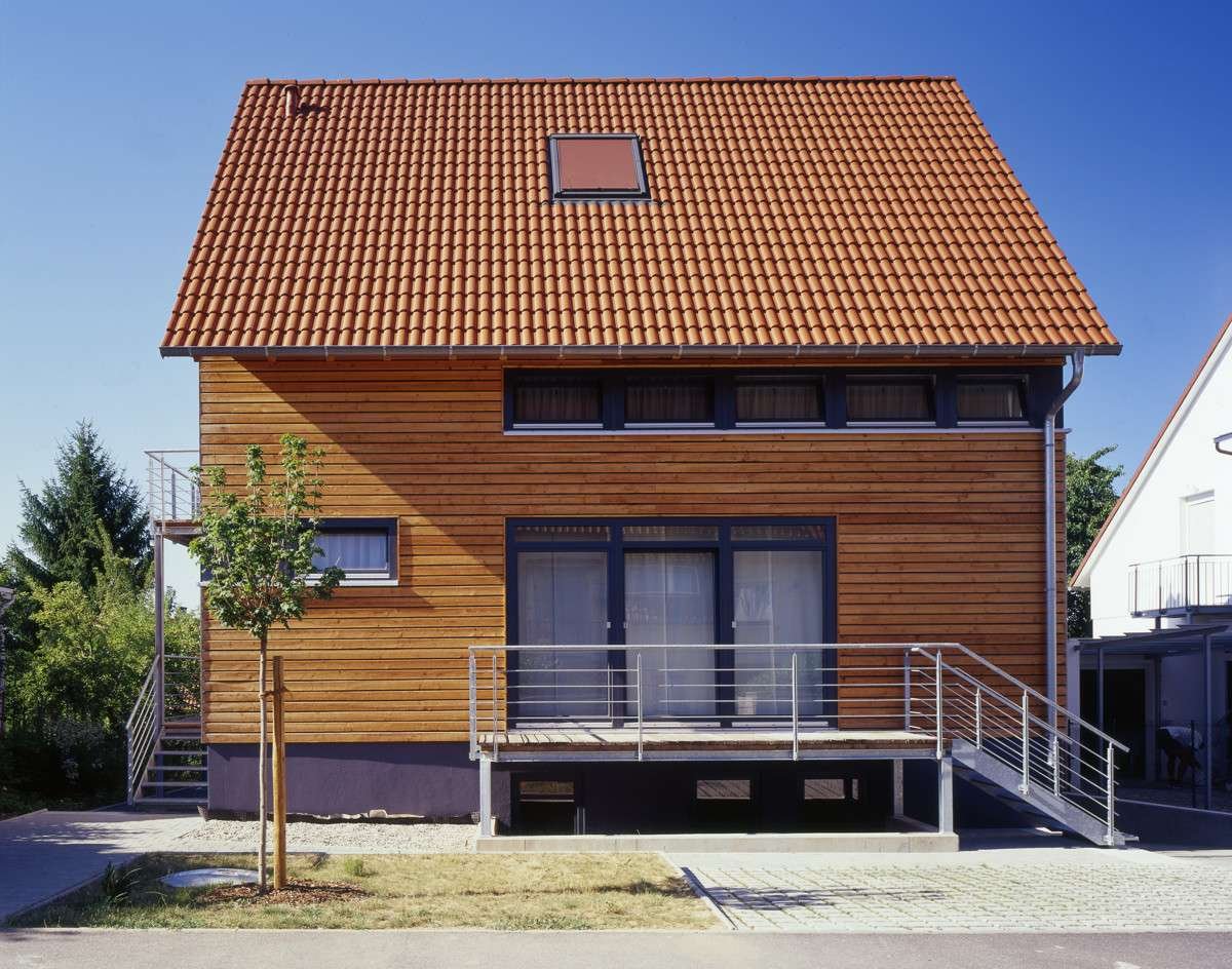 - Außenfassade mit Holzschalungen und im Sockelbereich verputzt