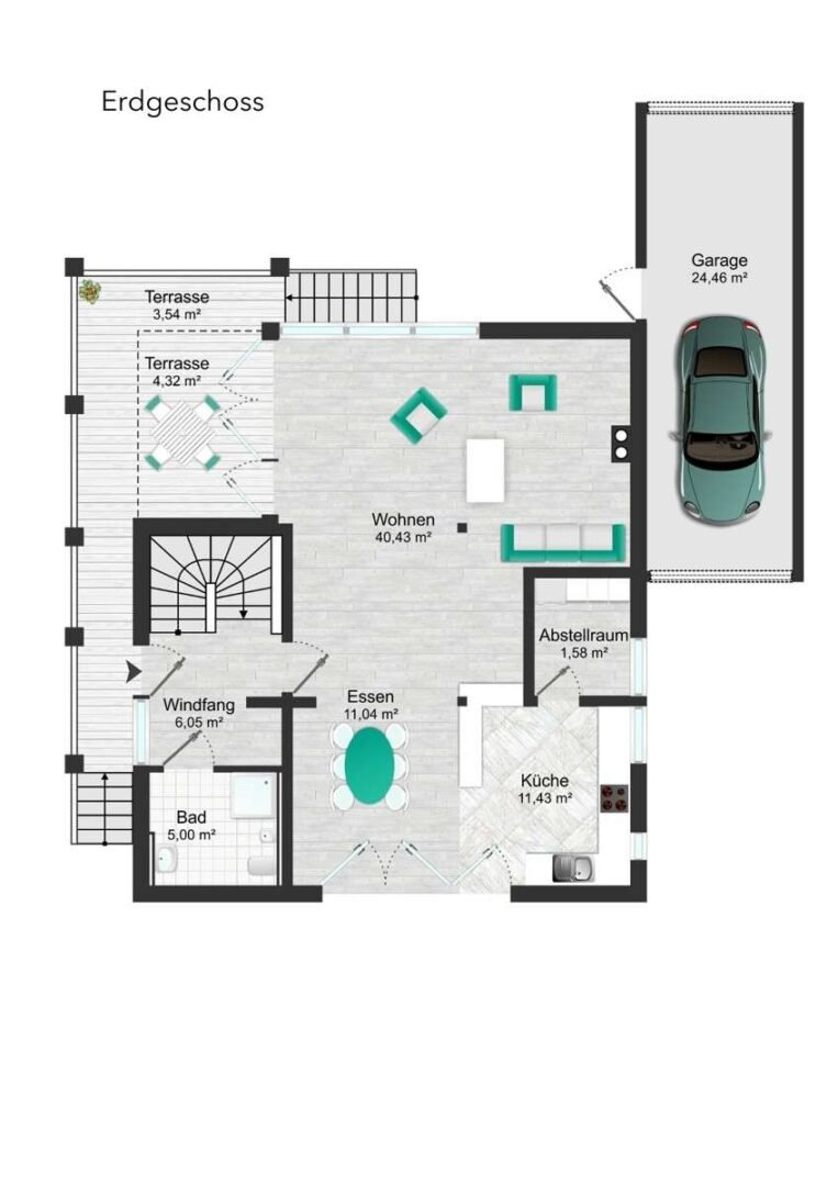 - Die Garage ist für zwei Autos vorgesehen und von vorne und hinten befahrbar