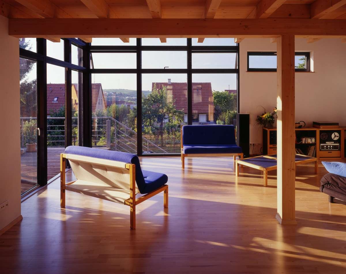 - Wohnbereich mit ca. 40 m² und Fenster, die vom Boden beginnen und sogar noch die offene Galerie mit Licht versorgen