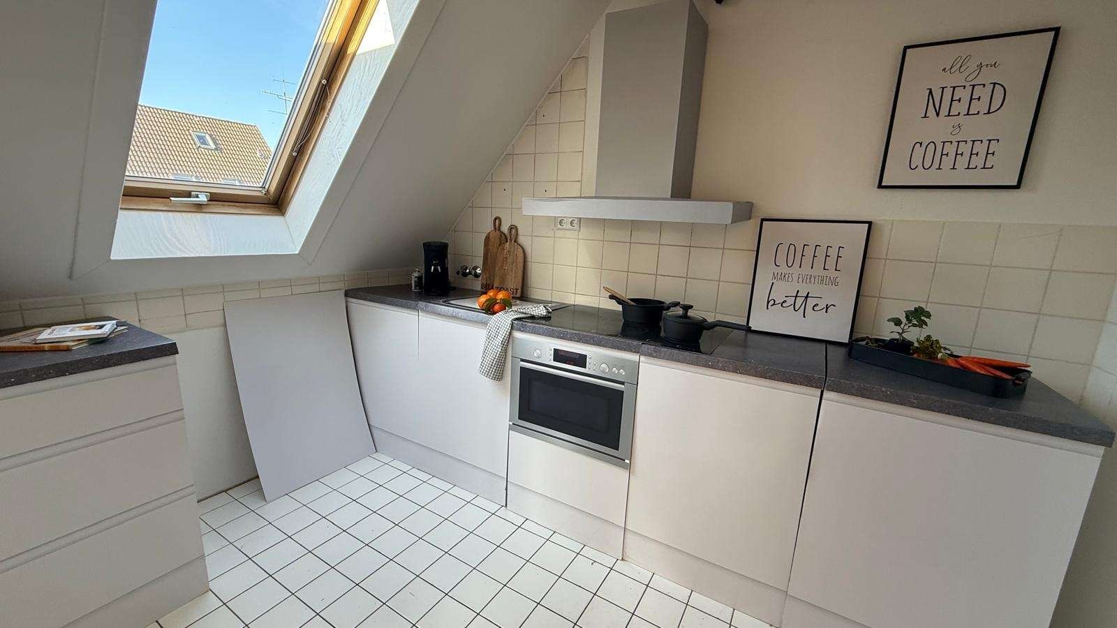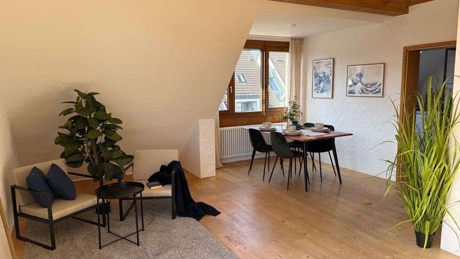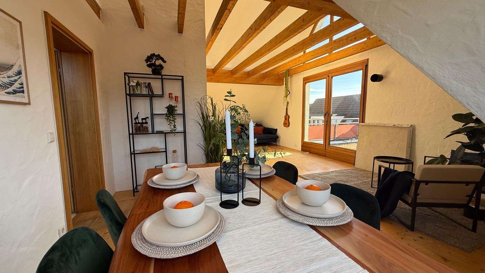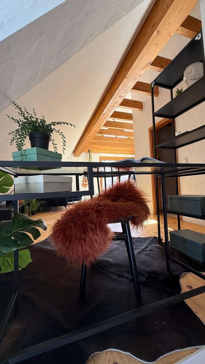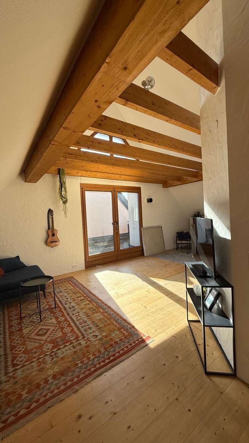 Die Wohnung befindet sich im Dachgeschoss eines gepflegtem Mehrfamilienhaus (5 Wohneinheiten). Der sehr große Wohn- Essbereich ist flexibel aufteilbar. Nicht nur ein schöner Essplatz und ein großzügiger Wohnbereich, sondern auch ein kleiner Homeoffice Platz lässt sich hier geschickt darstellen. Außergewöhnlich hier ist die Dachlandschaft, mit der sichtbaren Holzbalkendecke, die hier ein ganz besonderen Flair verleiht.